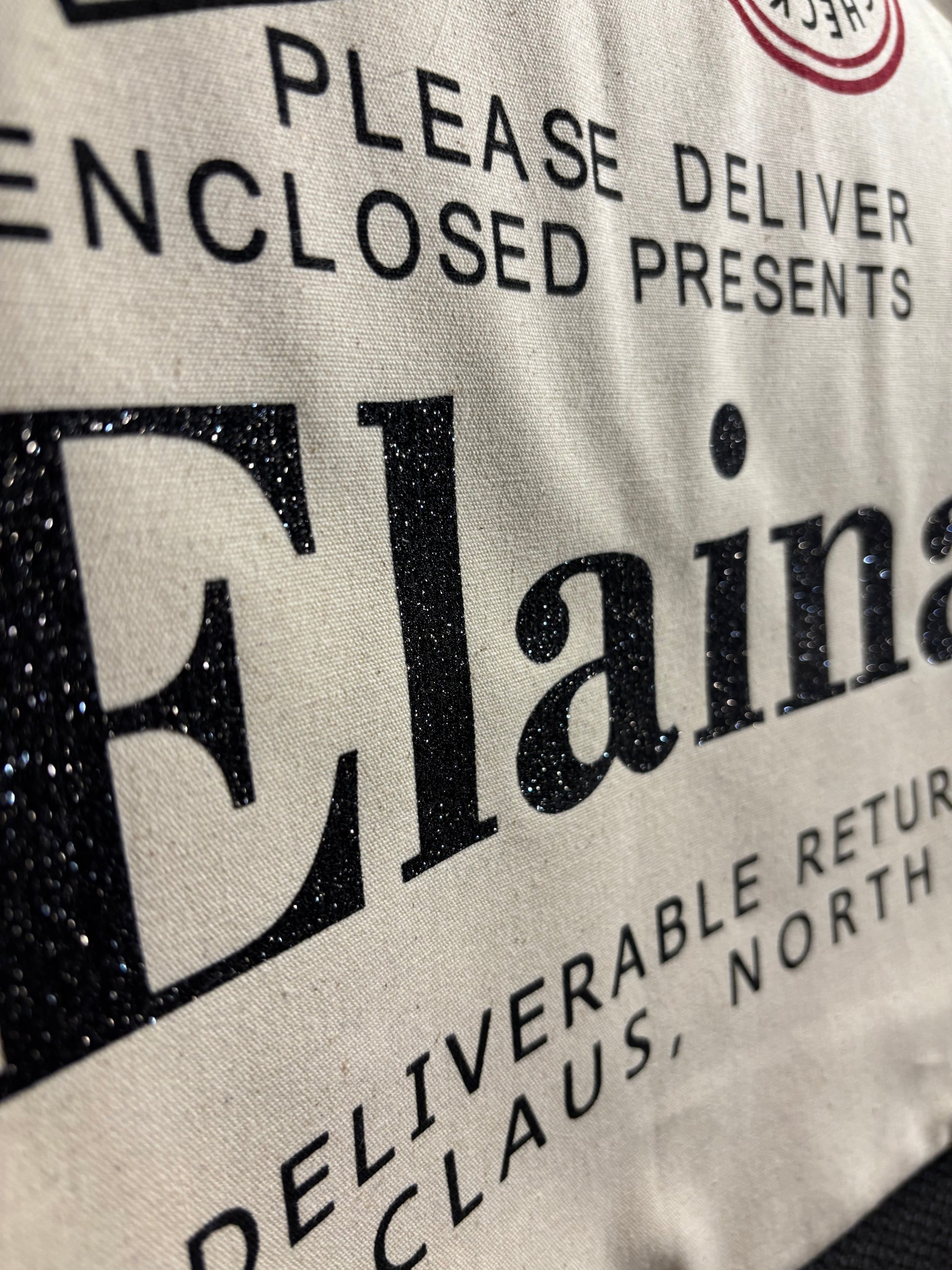 Santa Sacks customized with your child’s name. Name is done in black glitter iron on vinyl for a perfect magical touch.
