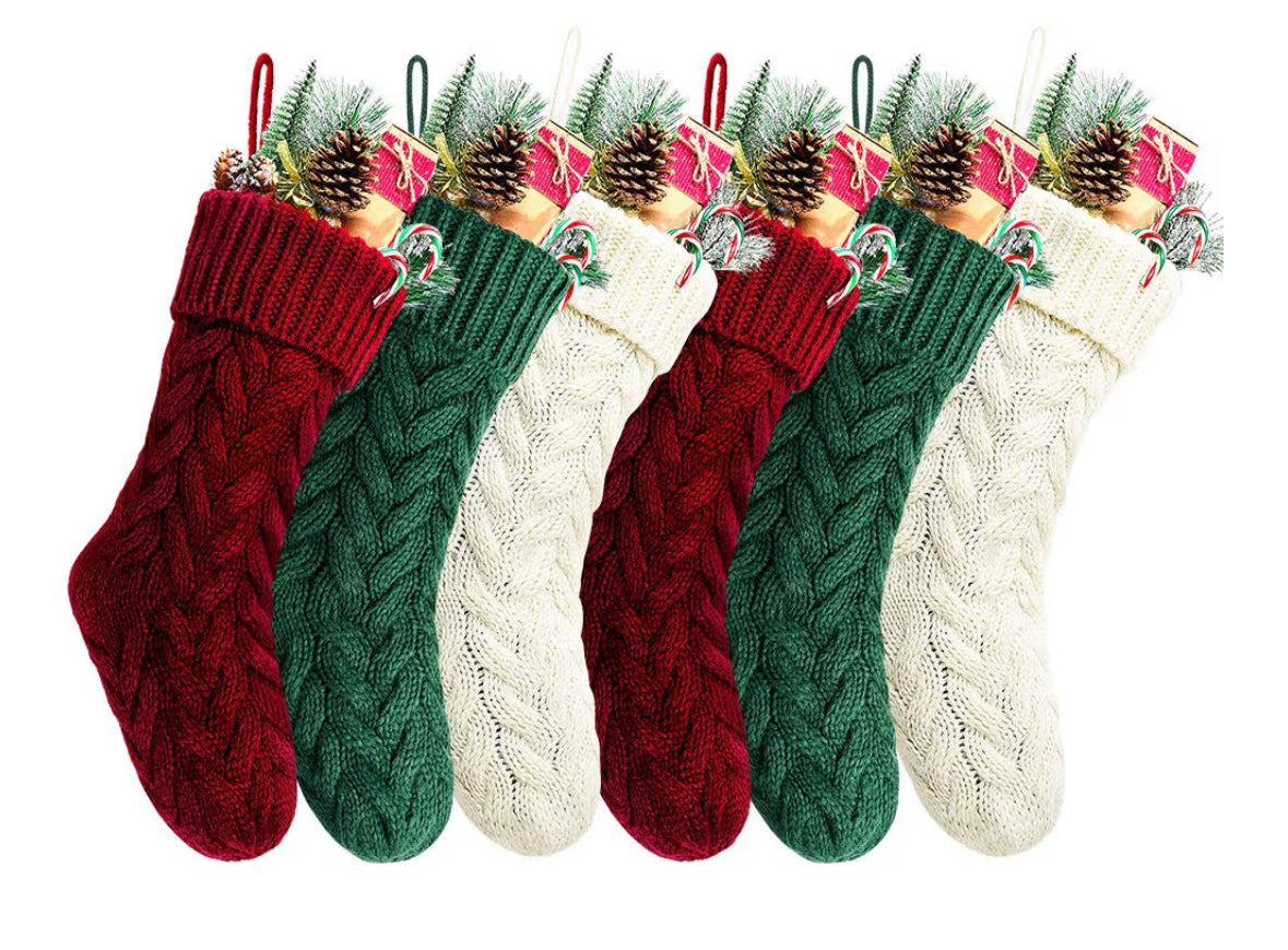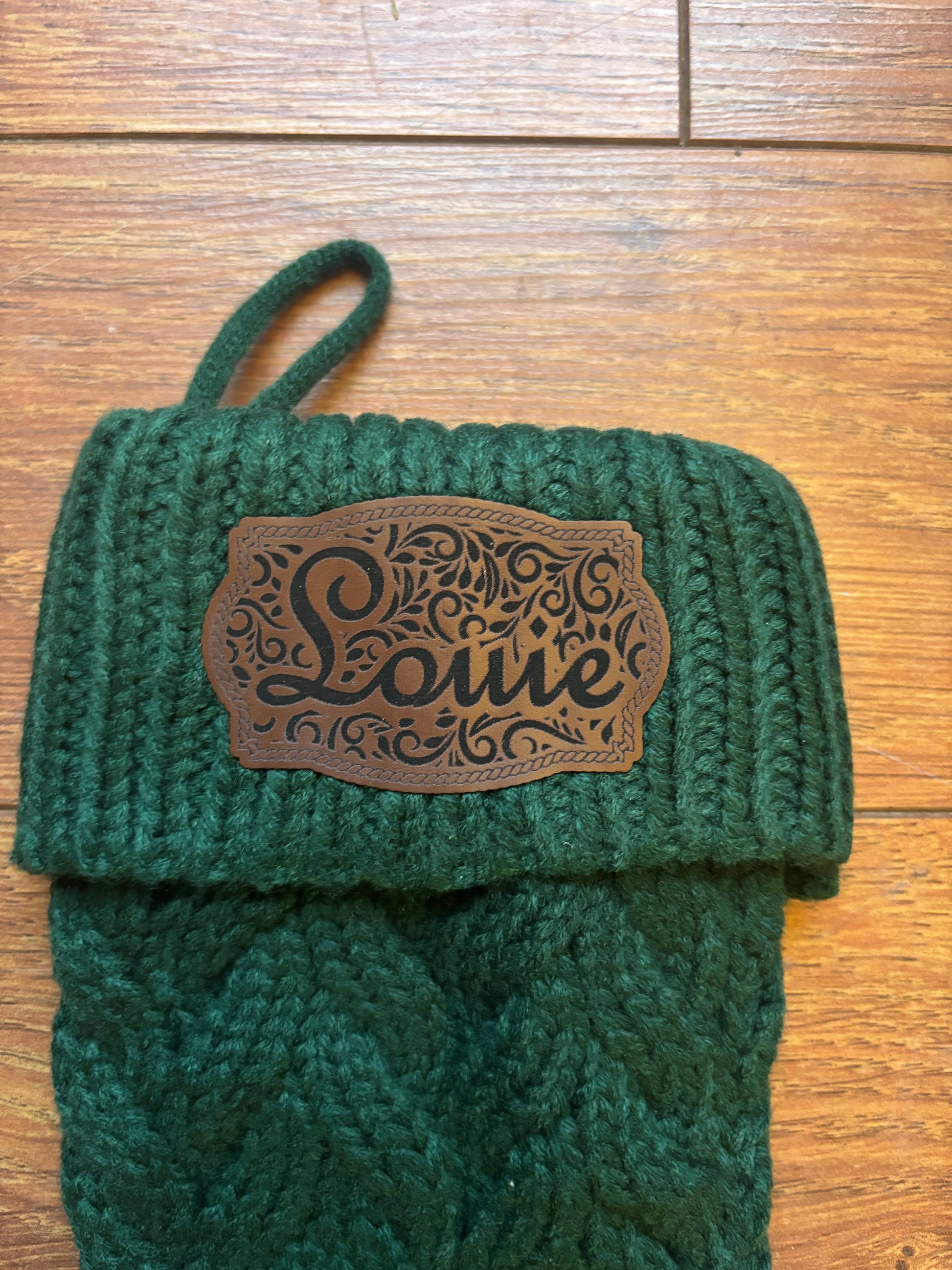Knit stockings customized with your name. Name is engraved on to faux leather which is permanently adhered to the stocking. Stocking measure 18” long.