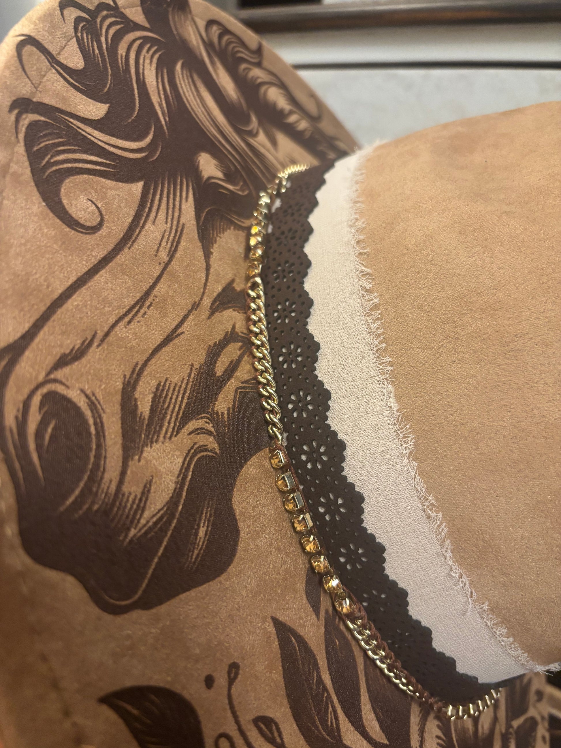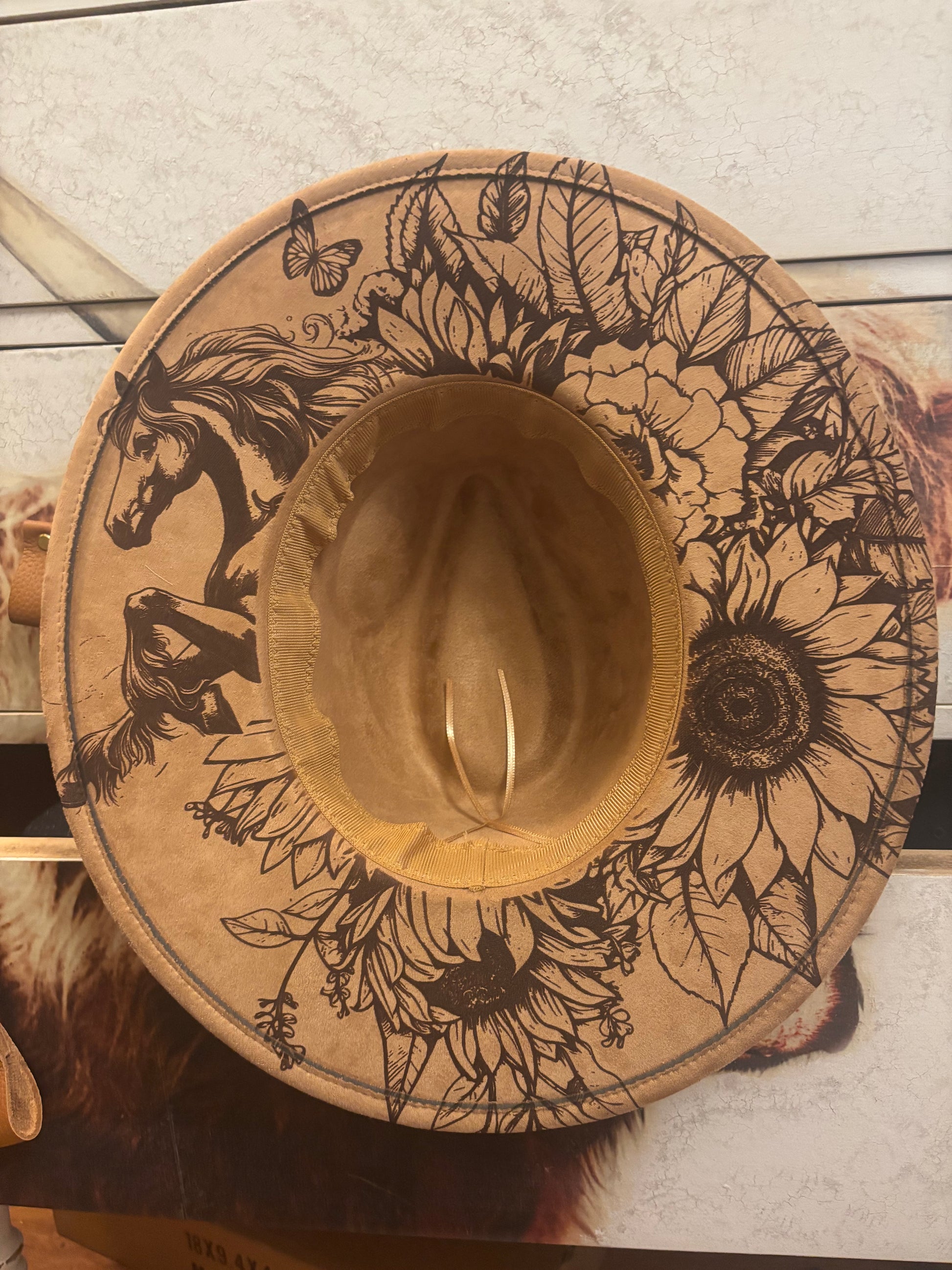 Introducing “Fire Horse” a faux suede wide brim fedora hat. The hat has a tie string inside allowing adjustments from 56-58cm. One size fits most. The design has been engraved into the camel colour fedora for a permanent, timeless look. Gold coloured rhinestone hat band, as shown, included. Removable hat pads included to ensure a perfect fit.