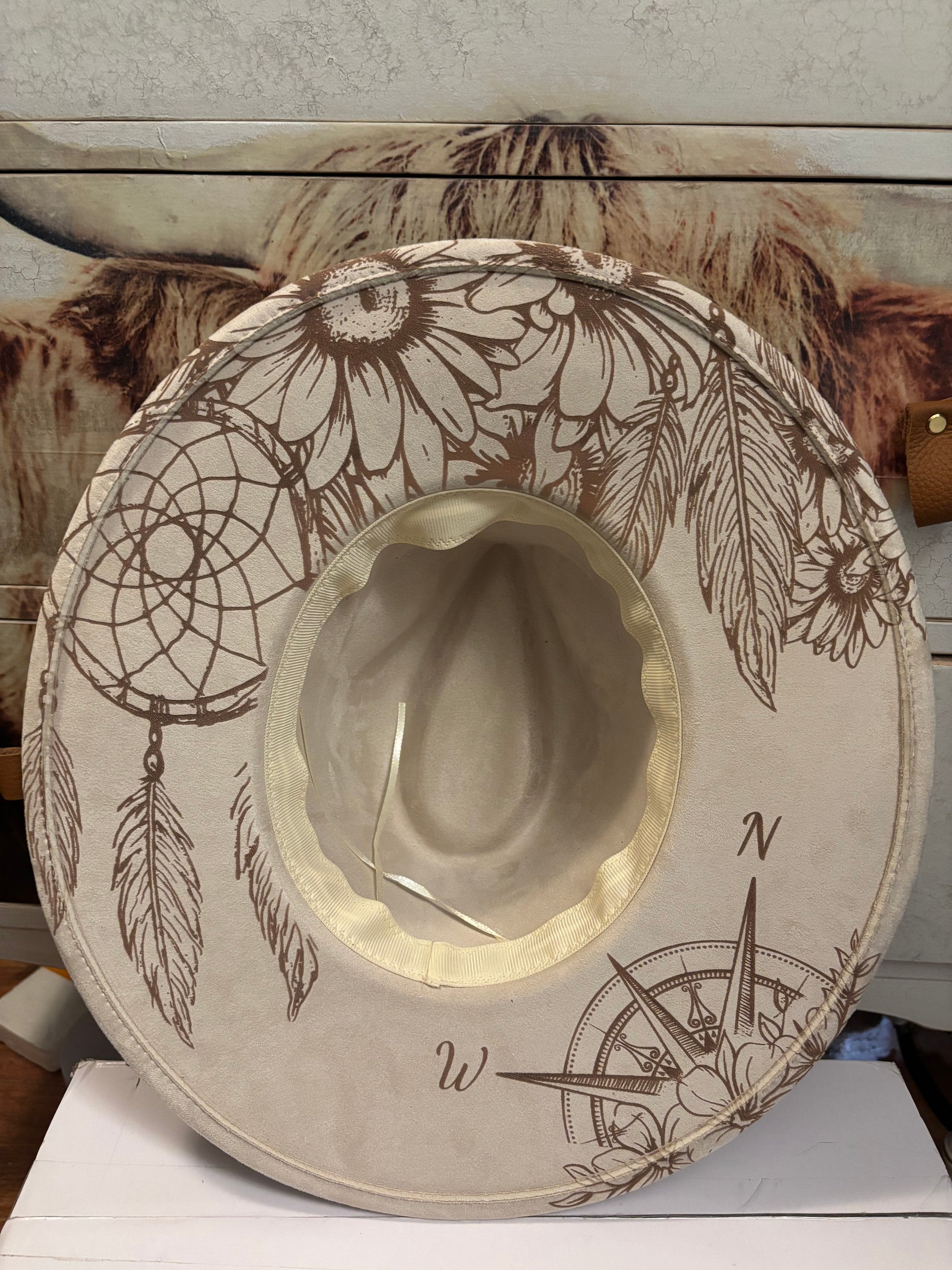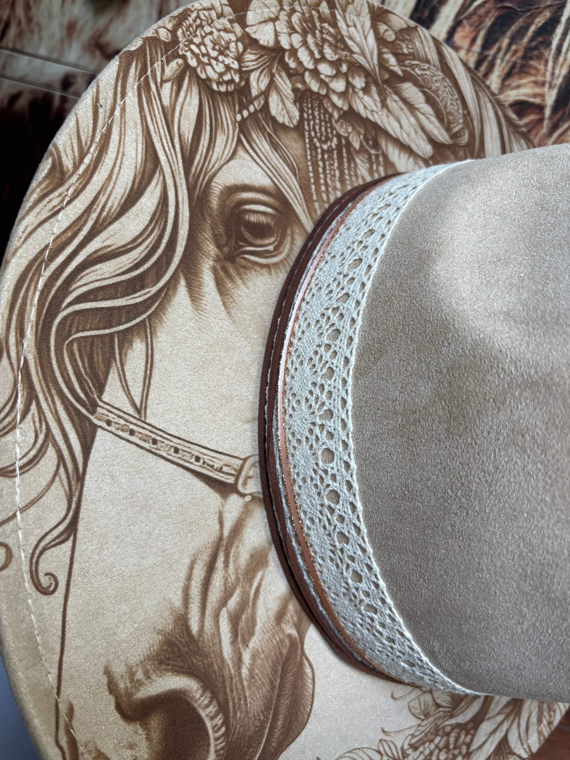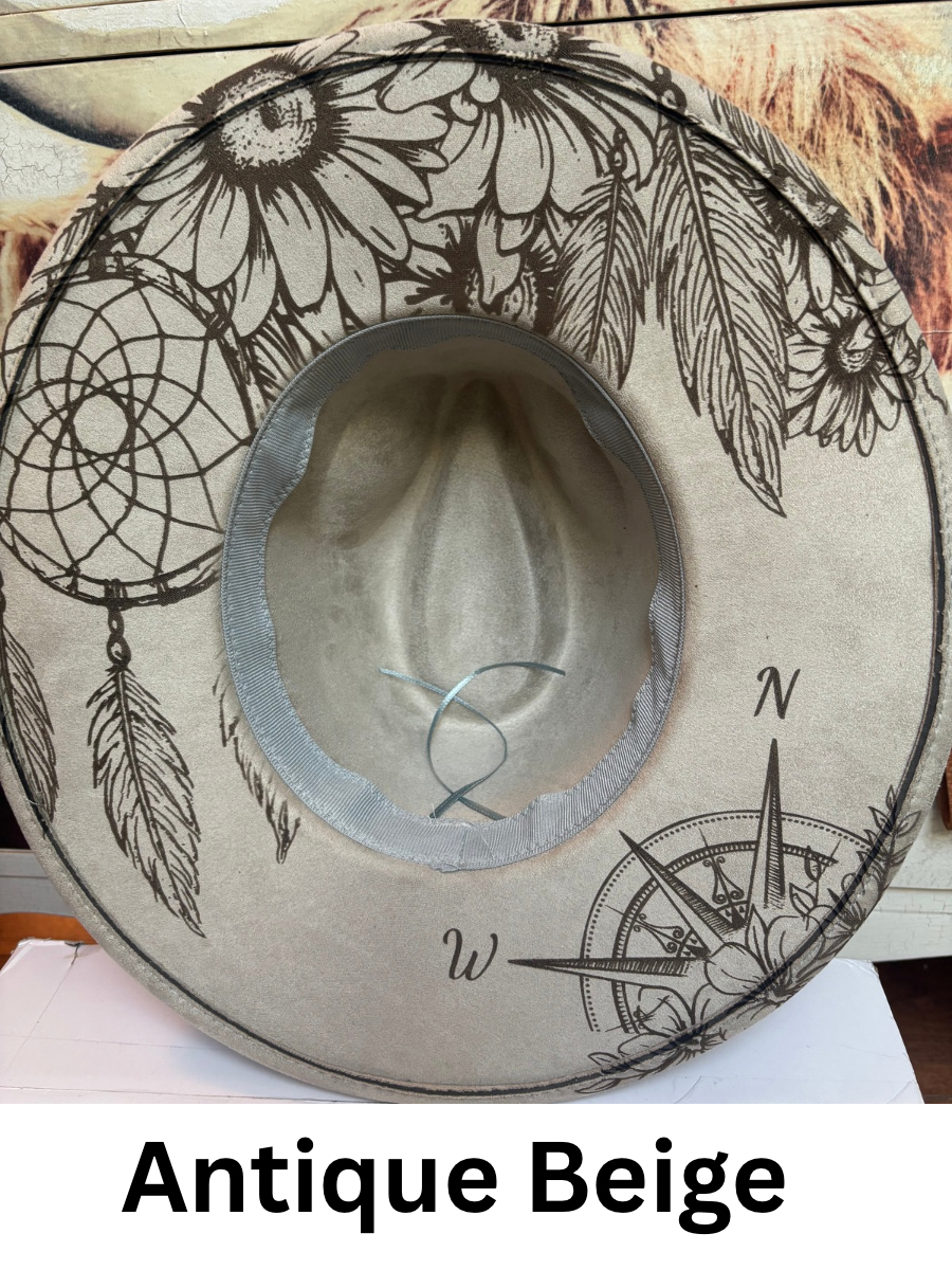 Introducing “Floral Steed Dreamer” a faux suede wide brim fedora hat. The hat has a tie string inside allowing adjustments from 56-58cm. One size fits most. The design is engraved on to the fedora for a permanent, timeless look. Removable hat pads included to ensure a perfect fit.