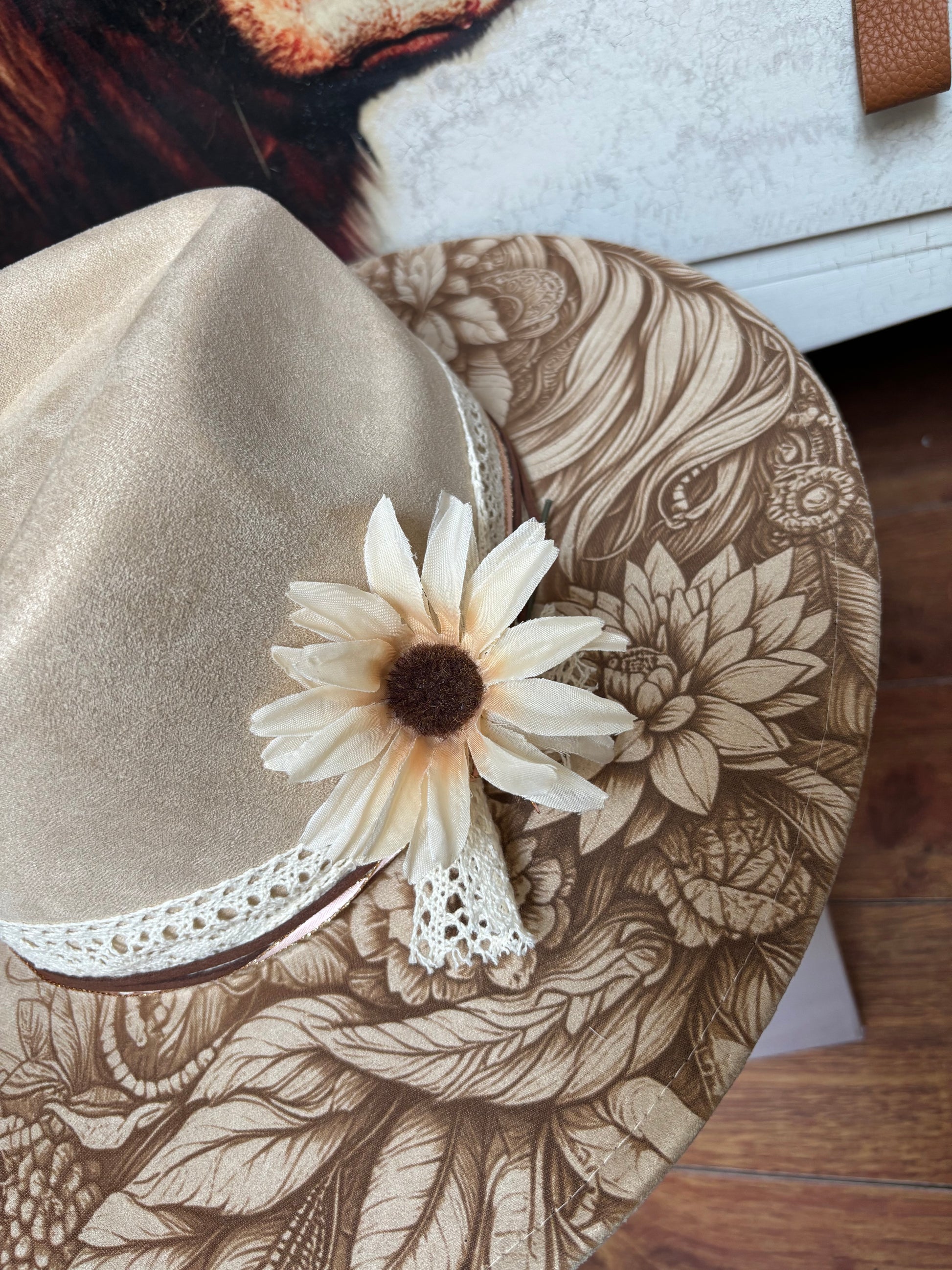Original images shown on dark beige with a floral hat band. The braided leather hat band, shown in the last 2 pictures, is included in the base price. The floral hat band is an additional charge