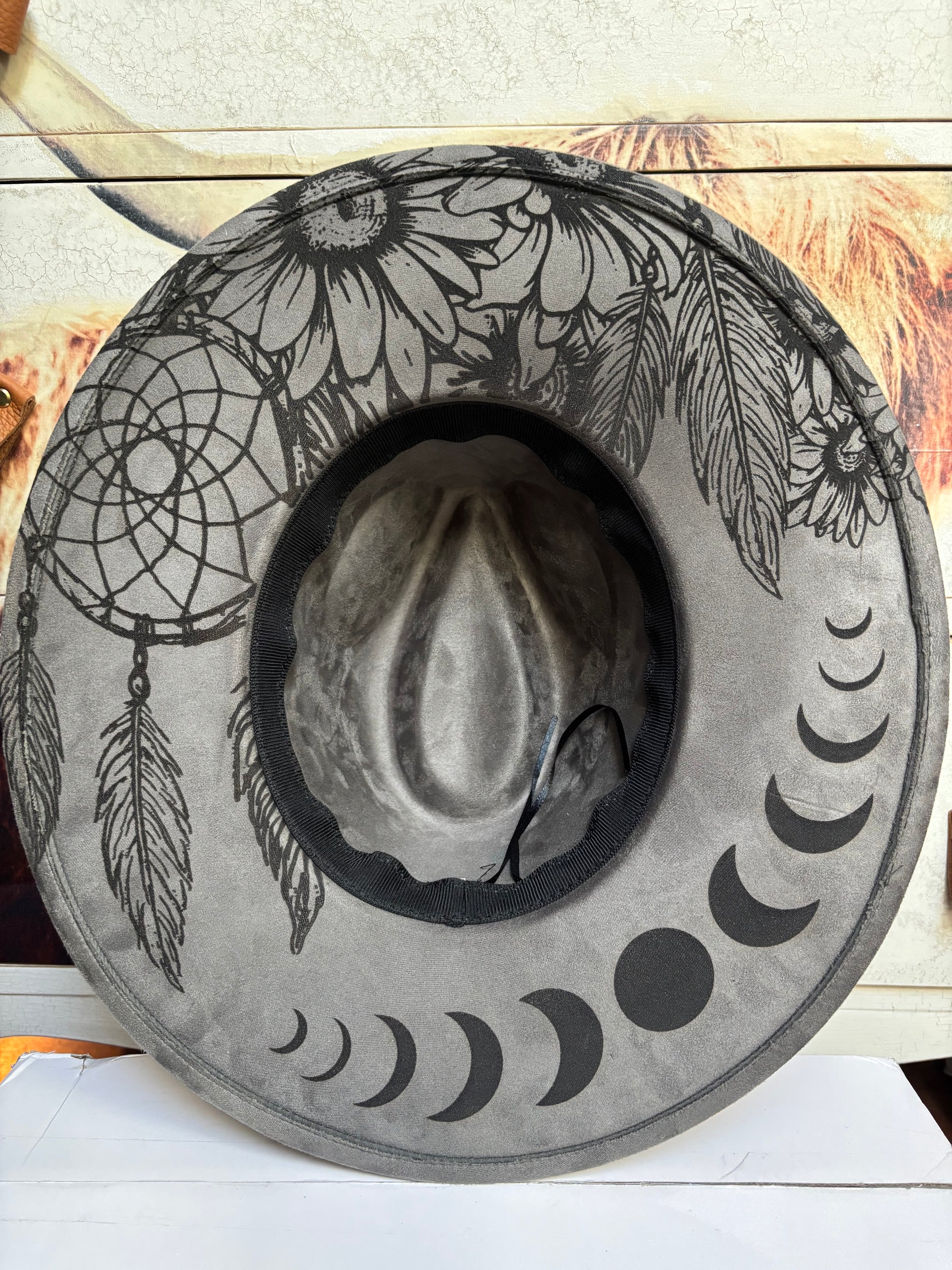 Introducing “Full Moon Dreamer” a faux suede wide brim fedora hat. The hat has a tie string inside allowing adjustments from 56-58cm. One size fits most. The design is engraved on to the dark greyfedora for a permanent, timeless look. Basic hat band, as shown, included. Removable hat pads included to ensure a perfect fit.