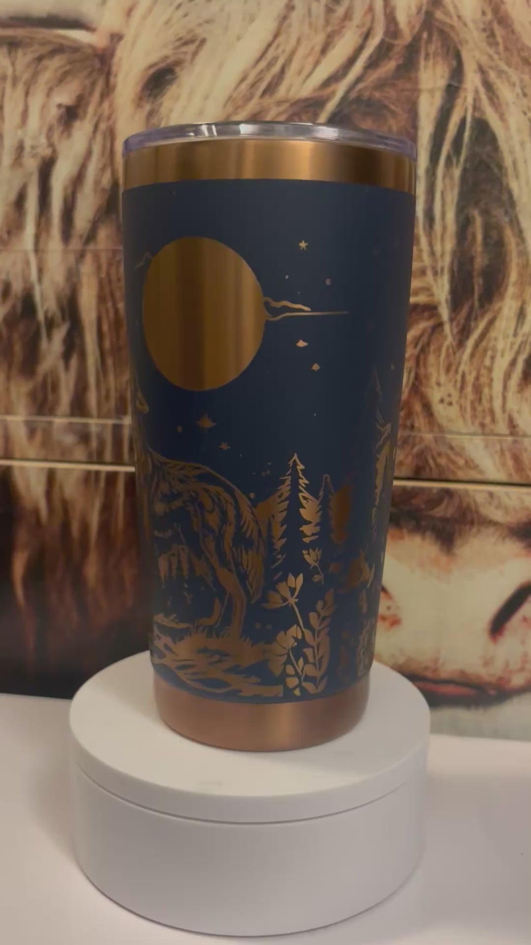 20oz double wall insulated stainless steel tumbler perfect for your hot or cold beverages. The howling wolf design is laser engraved in to the powder coating for a permanent finish. This tumbler comes with a magnetic slider lid for easy cleaning!