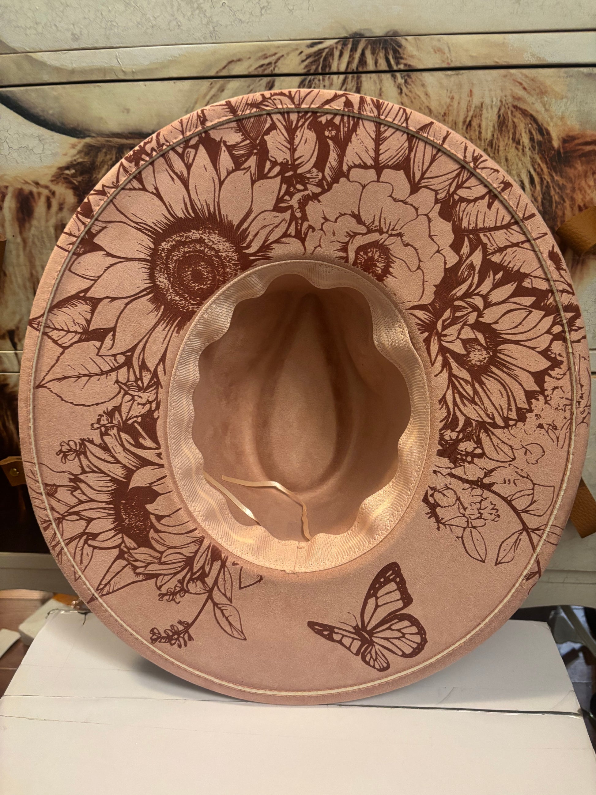 Introducing “Hummingbird in Flight”. The hat has a tie string inside allowing adjustments from 56-58cm. One size fits most. The design is engraved on to the dusted pink coloured fedora for a permanent, timeless look. Basic hat band, as shown, included. Removable hat pads included to ensure a perfect fit. This hat is in stock, ready to ship today!