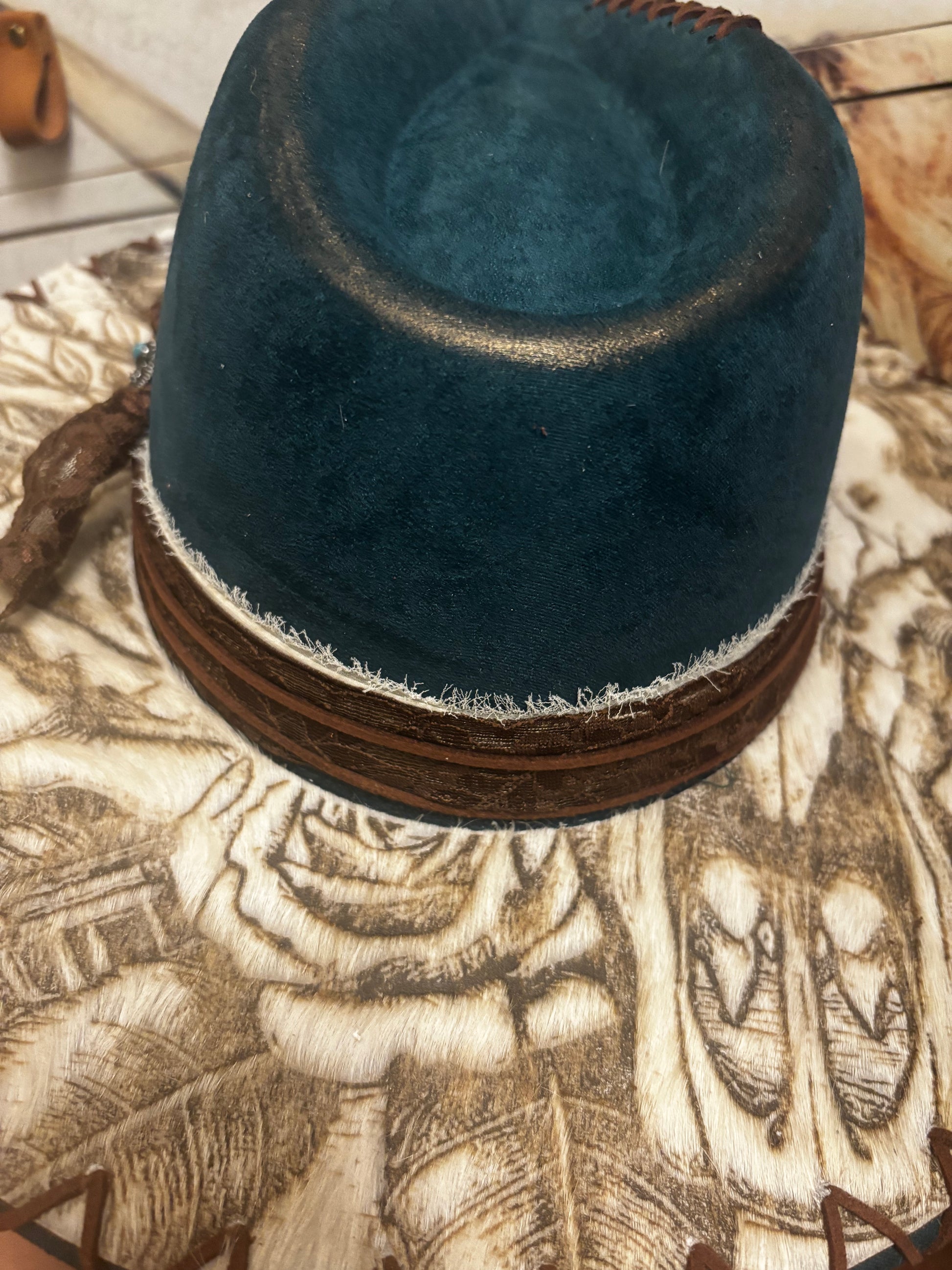 Introducing “Love Her But Leave Her Wild” a faux suede wide brim fedora hat. The hat has a tie string inside allowing adjustments from 56-58cm. One size fits most. The design has been engraved into a piece of genuine cowhide which has been permanently attached to the dark teal colour fedora for a timeless look. Laced hat band, as shown, included. Removable hat pads included to ensure a perfect fit.