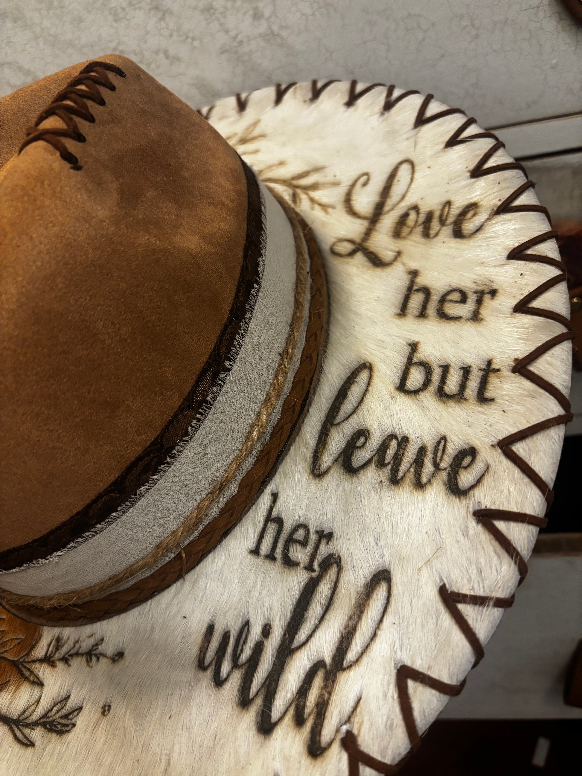 Introducing “Love Her But Leave Her Wild” a faux suede wide brim fedora hat. The hat has a tie string inside allowing adjustments from 56-58cm. One size fits most. The design has been engraved into a piece of genuine cowhide which has been permanently attached to the camel colour fedora for a timeless look. Hat band, as shown, included. Removable hat pads included to ensure a perfect fit.