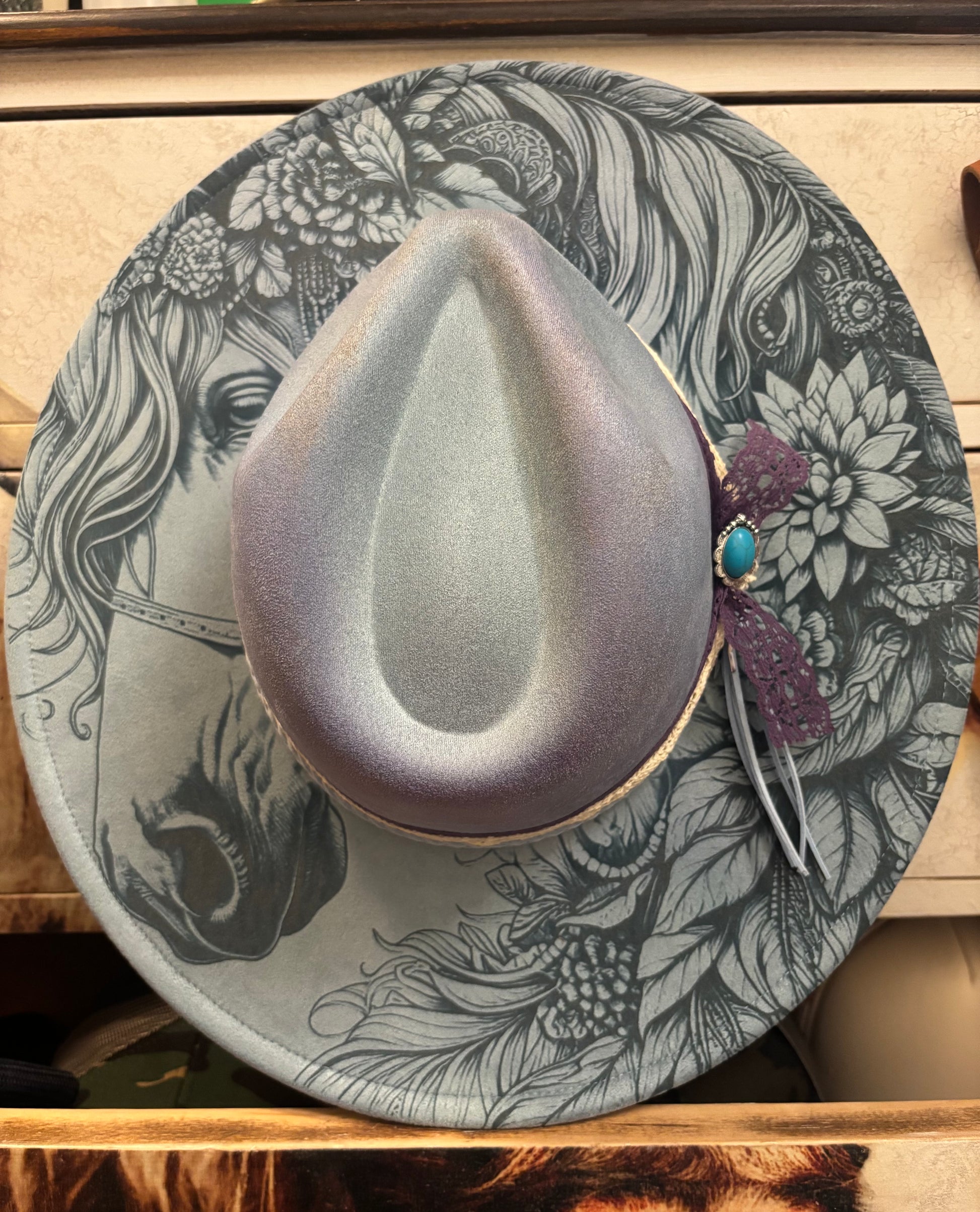 Introducing “Mystic Floral Steed” a faux suede wide brim fedora hat. The hat has a tie string inside allowing adjustments from 56-58cm. One size fits most. The design was first engraved on to the fedora and then the hat was hand painted in a water colour technique. The hat has been sealed with multiple coats of Scotch Guard to lock the colours in. Removable hat pads included to ensure a perfect fit.