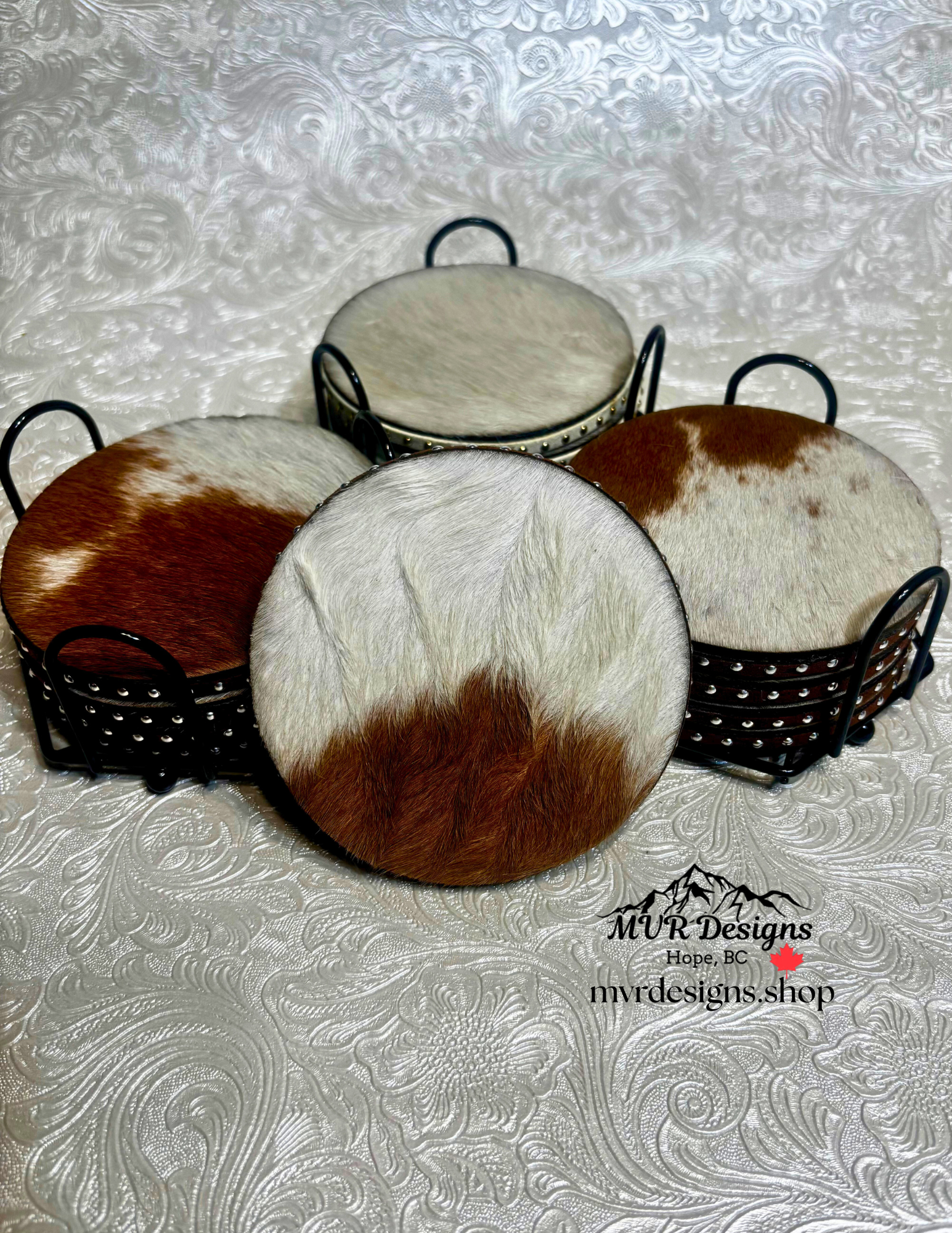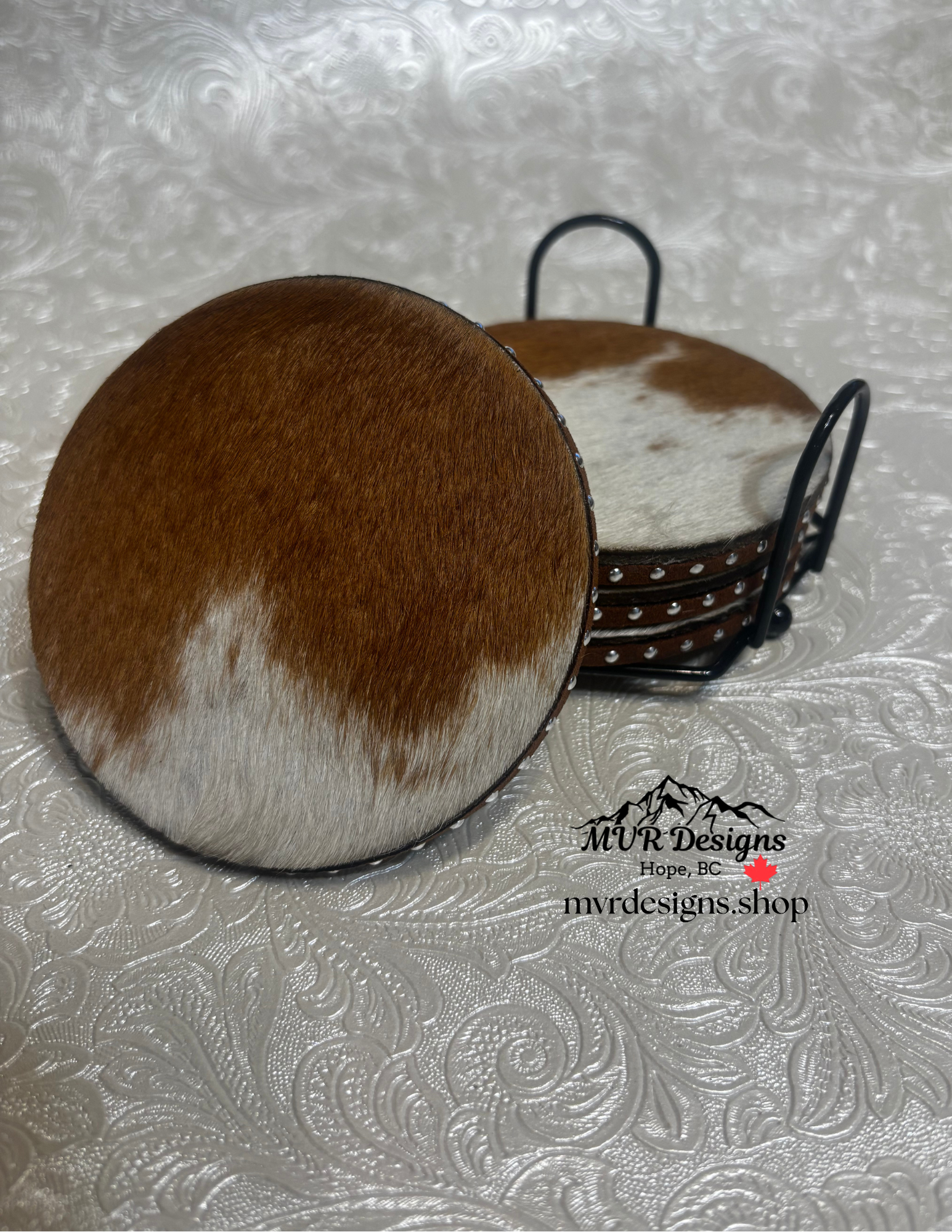 Set of 4 personalized, laser engraved, genuine cowhide coasters. Features a cork bottom and includes a black metal wire coaster holder. These make great gifts for weddings, anniversaries, or special occasions. Select the set you want, as shown in photos. After purchase you will be contacted by email to complete the custom design process. As these coasters are a custom order they are final sale. A mockup will be sent for approval before the coasters are engraved. Turn around time is 48 hours after the final design is approved.