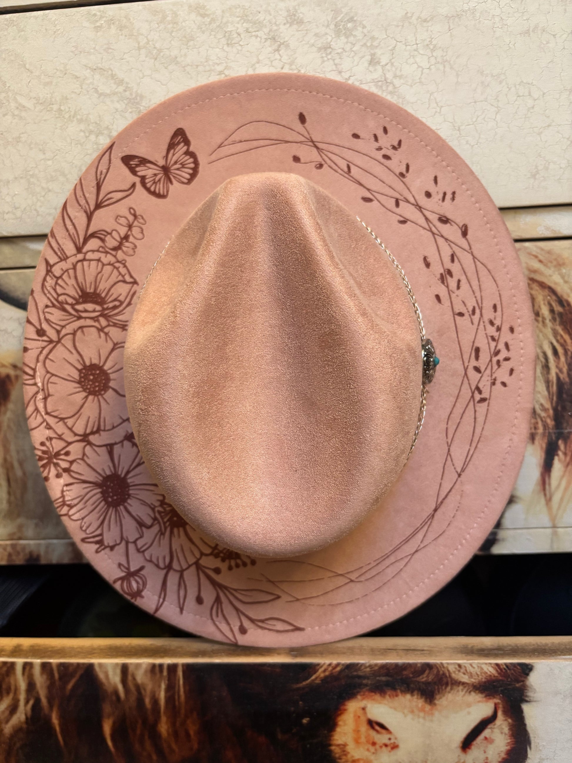 Introducing “Pink Floral Dream” a faux suede short brim fedora hat. This youth sized hat has a tie string inside allowing adjustments from 17.5-22.25”. This Fedora style hat is considered short brim, with a 2.65” brim. The design is engraved on to the dusty pink coloured fedora for a permanent, timeless look. Turquoise pin hat band included, as shown. Removable hat pads included to ensure a perfect fit.